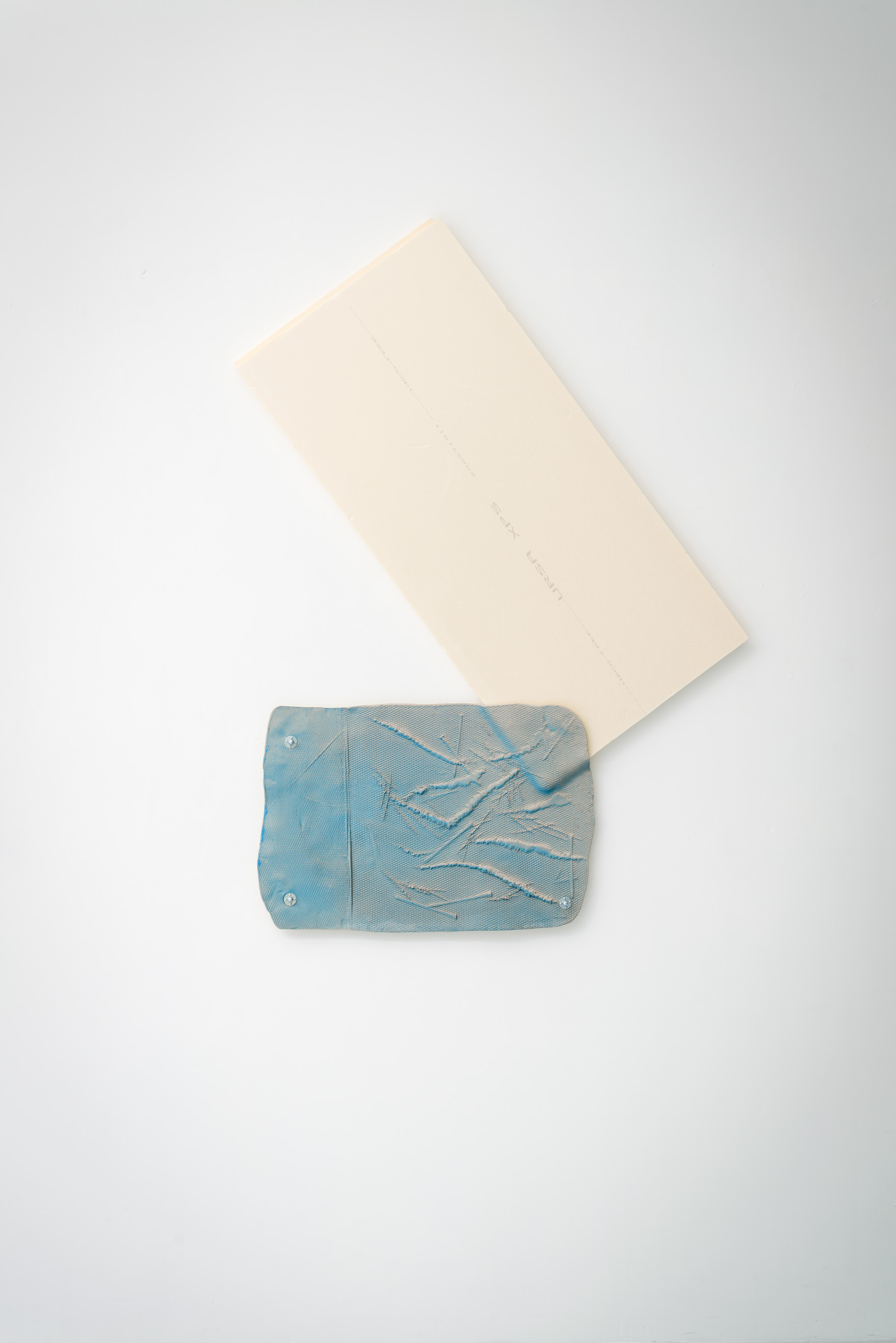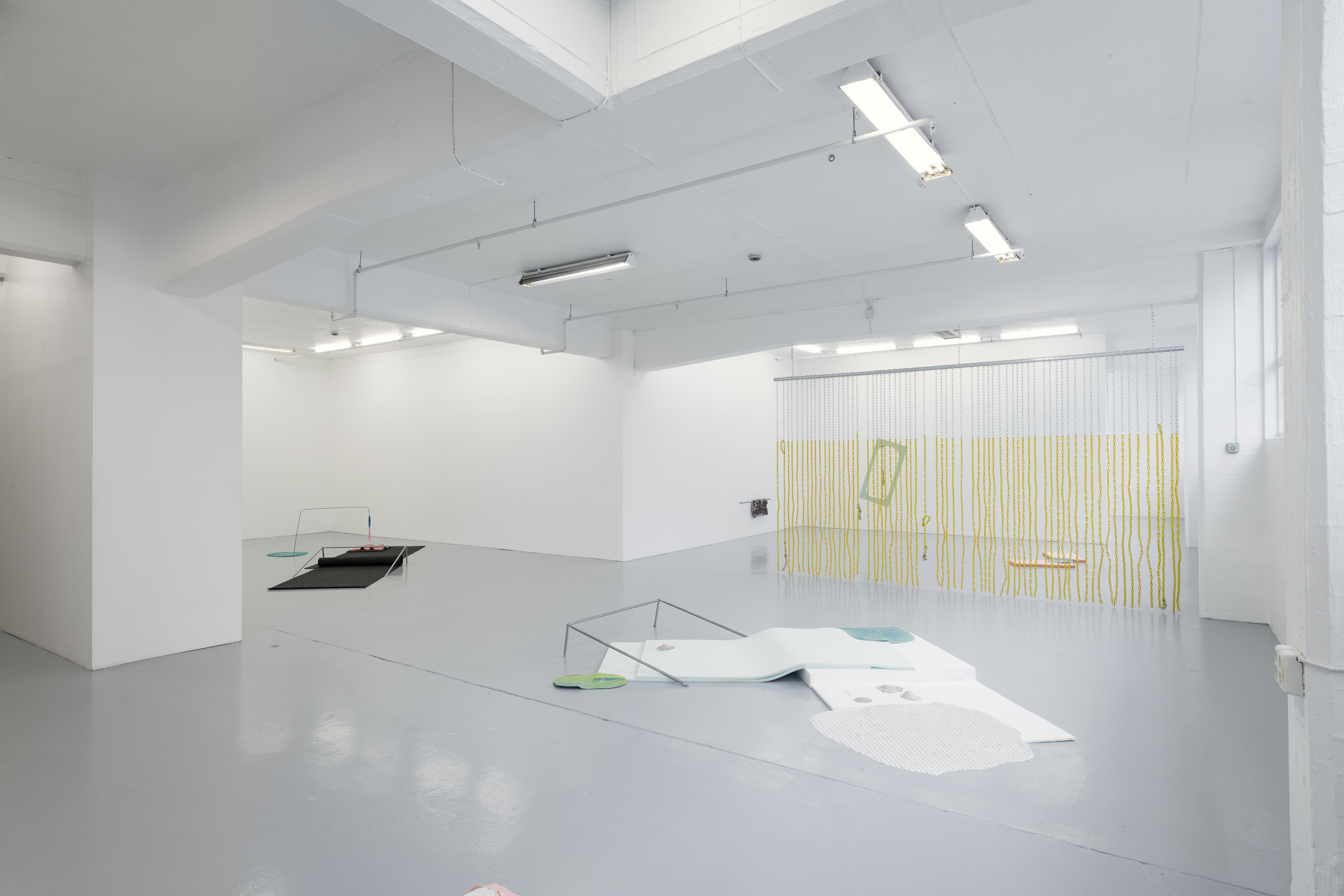 In Abbreviated Extensions, Vera Kox’s first solo show at Galleri Opdahl, objects are transitory and transformable; rooted and fixed; but liquid and moving, shimmering, collapsed, filthy, incandescent. Materials beg to be touched, with their subtle faces raised and textured, but insist on opacity and discrete surfaces — a calculated layer of strange stretched coolly over the familiar. A swathe of cerulean ceramic is held just above the floor by two blocks of foam, their edges discoloured by time or by light, or by whatever else pressed against them the hardest. The blue collapses gently under its own weight, its belly kissing close to the ground, the texture of its surface depressing to reveal the straight edges of the shapes beneath. The ineluctable pull of gravity and grace. Desire to touch this pool of blue, this smear of sky that scatters the mind — to dip a toe, and then plunge. Desire to run fingers through this neon streak of hair, which beckons elusively with its silky falseness. The stutter of impossibility, a sickness in the gut. Question after question, patiently superimposed. How is it that glass can seem so soft; and what happens through this green frame askew, with its foreground pierced by chains and a metal rod? What food is this, artificial and yet ripe for consumption — proffered on plinths, shrink-wrapped in cellophane and held so tenderly on glazed promontories?