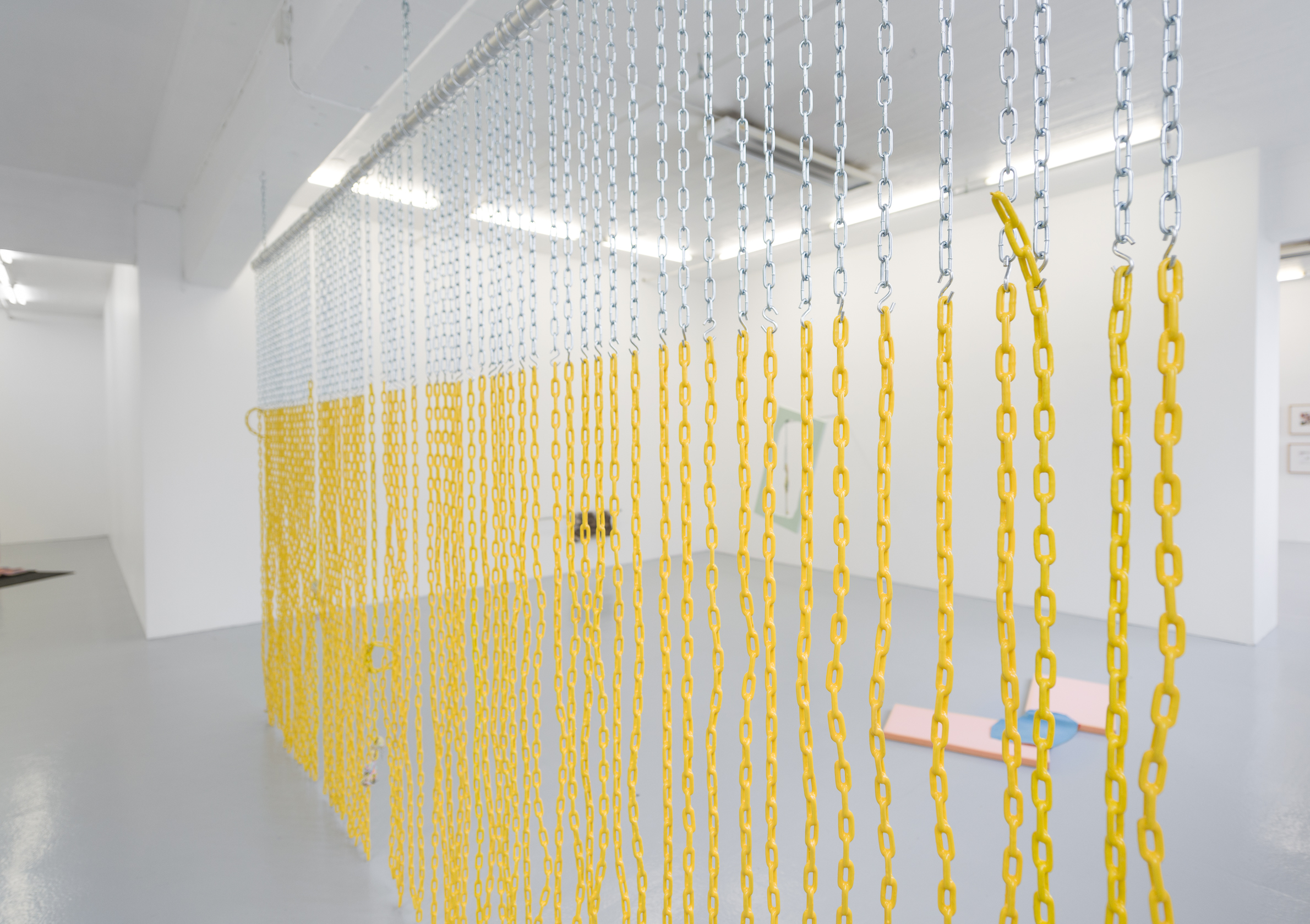 Around these fallen objects, slumped and spilling, molten and solid — transient states — abbreviated extensions — where do the bodies go? Or need there be a body at all, to witness these mute and tensile complexes. These chains that hang — from the ceiling, from the walls — cut through the rooms, pushing emptiness with their swaying, striated forms. They press against the skin of the space, which is brimming with invisible, negative volumes: absence is endured, manipulated, produces new rhythms, structure and syntax. The language here, in Kox’s world of materials estranged and intimate, is one of accretion and entropy. A world — which is also our world — this world — the world — in which chains bind and link disparate matter, suspend and swing and conjure as many absent metonymies as they can bear.