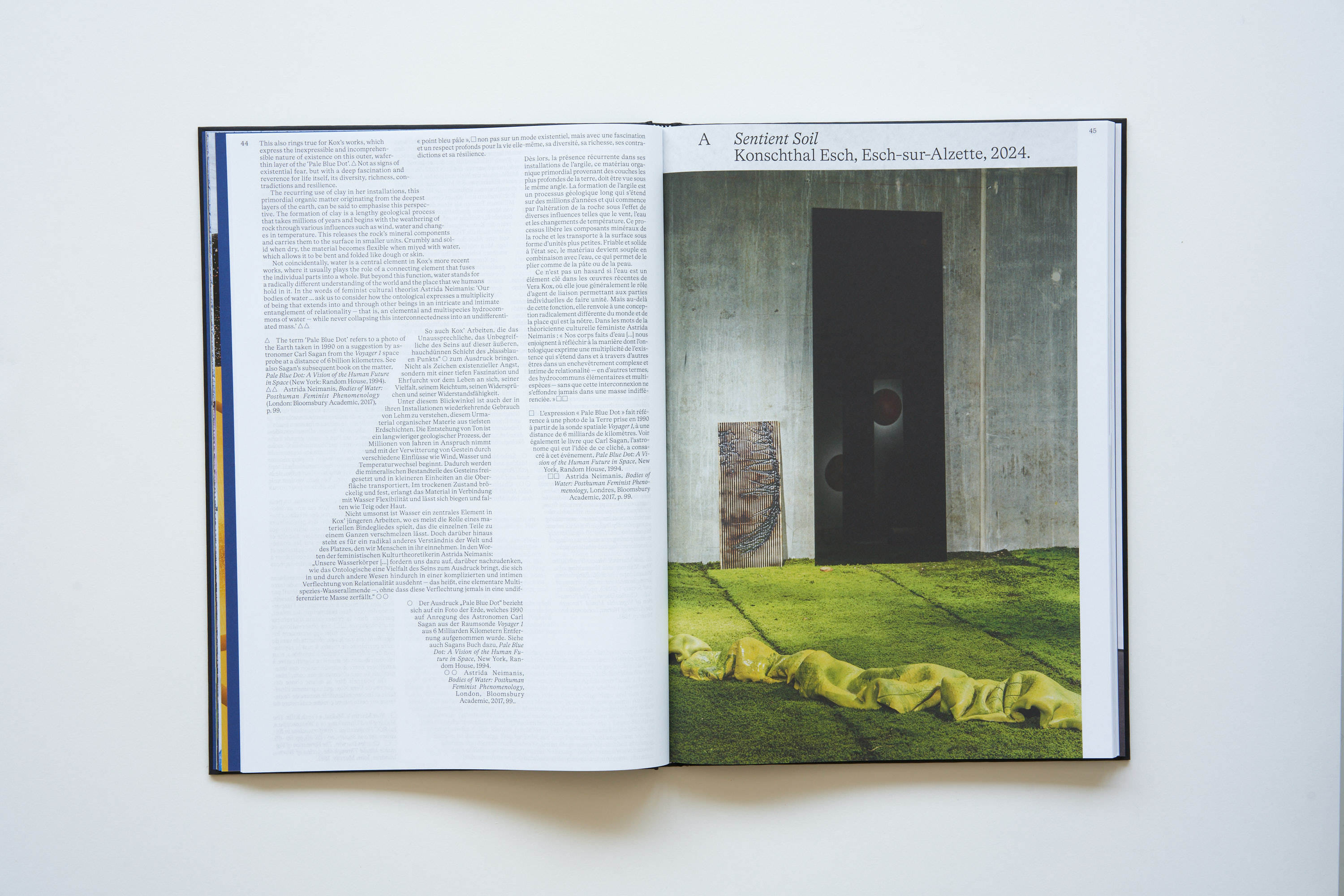 Into is the first monograph on the work of Vera Kox, spanning over ten years of the artist’s multidisciplinary practice. It is published on the occasion of her solo exhibition Sentient Soil at Konschthal Esch. Kox reflects on the human impact on post-industrial ecologies and their tangible traces, envisioning a transition from a human-centered perspective to a multi-species worldview. Across her sculptural practice, she acknowledges the inherent agency of the material itself, with a specific emphasis on the ceramic medium. This richly illustrated volume includes essays by Lisa Robertson, Alison Sperling and Charles Wennig, as well as a conversation between Sarah Ihler-Meyer, Marianne Derrien and Vera Kox.